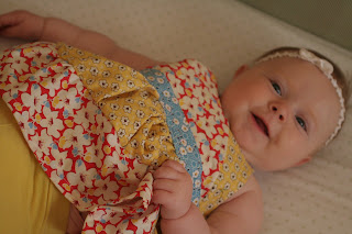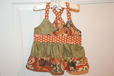 Construction: I sewed the front and back bodices together for the lining and then the main fabric. Then I sewed the straps and attached them between the main fabric and lining (on the front only) and sewed all along the top of the bodice (lining and fabric) right sides together. I left the bottom as a raw edge since the sash and ruffle would cover the raw edge. I pressed a fold on the bottom and top of the sash and topstitched to the bodice. I sewed the first ruffle to the bottom of the sash and had to fold and sew to enclose the seam. Not exactly what I wanted but I made it work. I hemmed the bottom ruffle and attached it to the top ruffle. I made button holes on the back of the bodice for the straps to go through and tie.